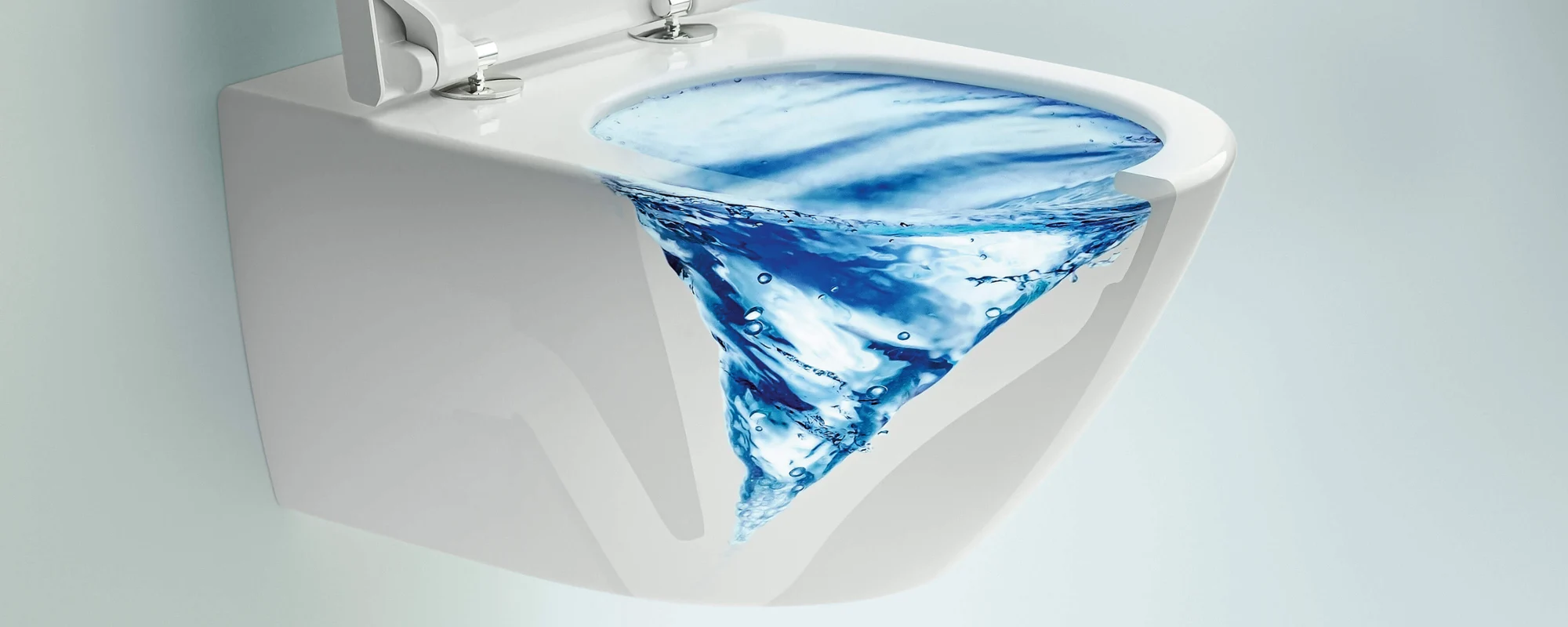 The TwistFlush technology, the subject of a patent application, is revolutionising toilet cleaning with a powerful water vortex. Its exceptionally powerful flushing exceeds the main flush standards.[0] Soiling doesn’t stand a chance with the water vortex which covers almost the entire inner bowl of the toilet for thorough cleaning.